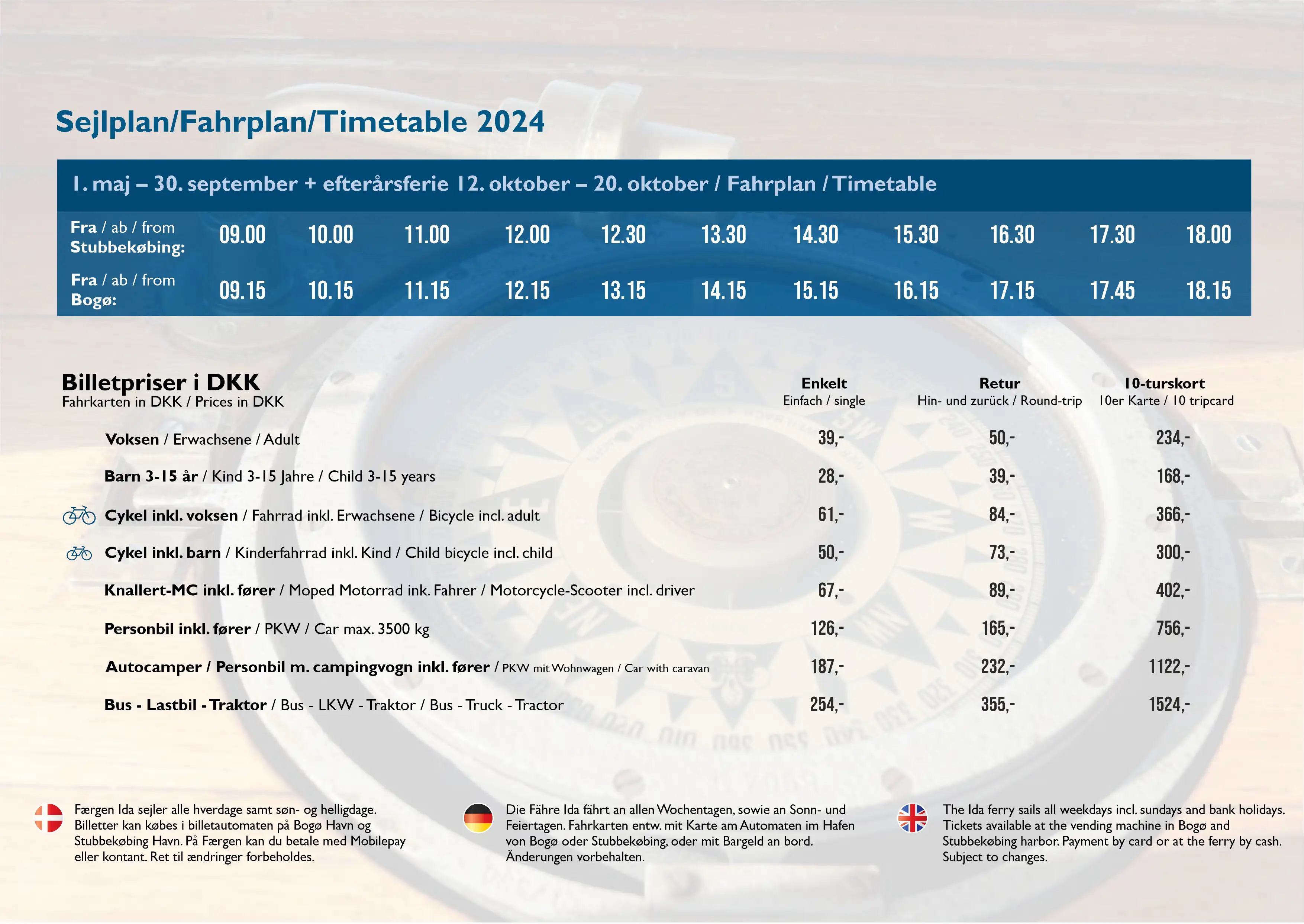 Vi sejler fra 09:00-18:15 alle dage i perioden 1. maj til 30. september og i efterårsferien 11.- 19. oktober.