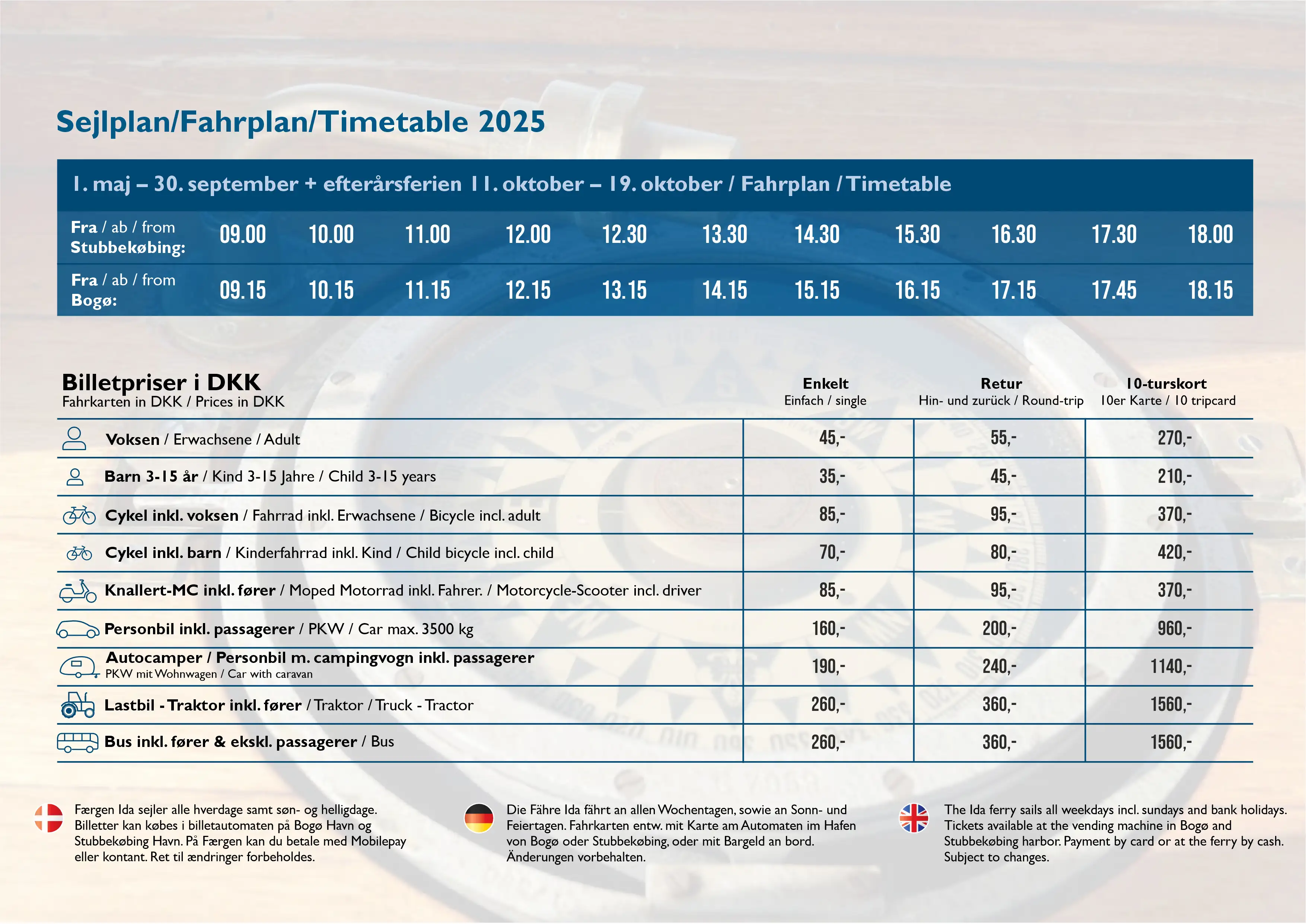 I 2025 kan vi glæde jer med, at vi sejler fuld sejlplan med 11 daglige afgange fra henholdsvis Bogø Havn og Stubbekøbing Havn.